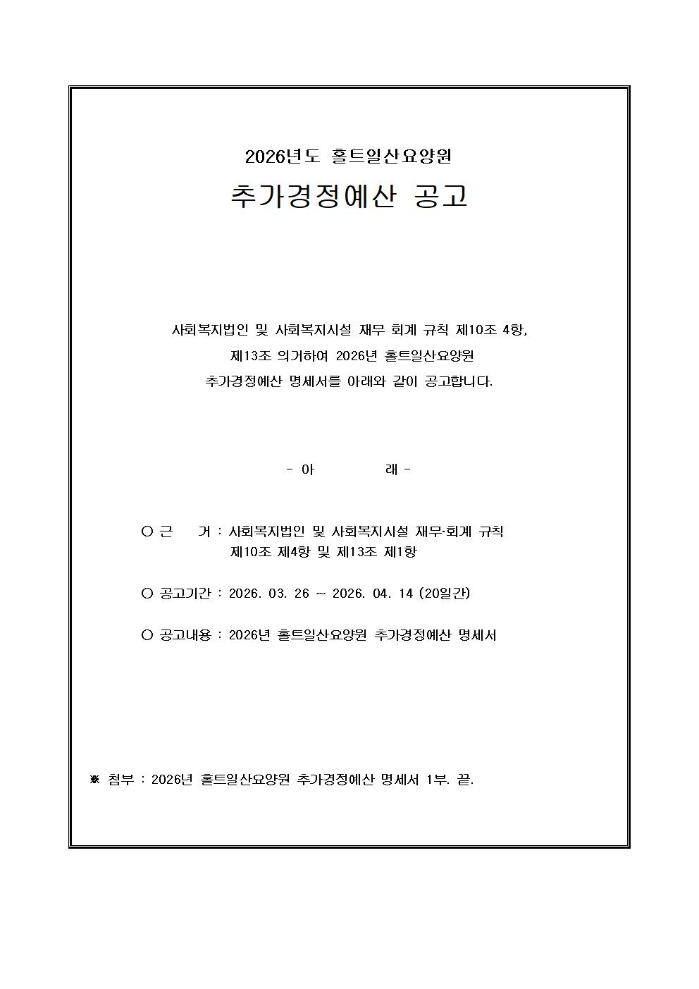 [홀트일산요양원] 2026년 추가경정예산 공고