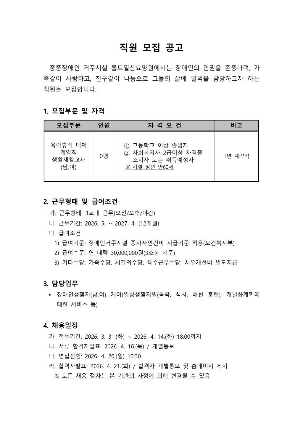 [홀트일산요양원] 직원(생활재활교사) 모집공고